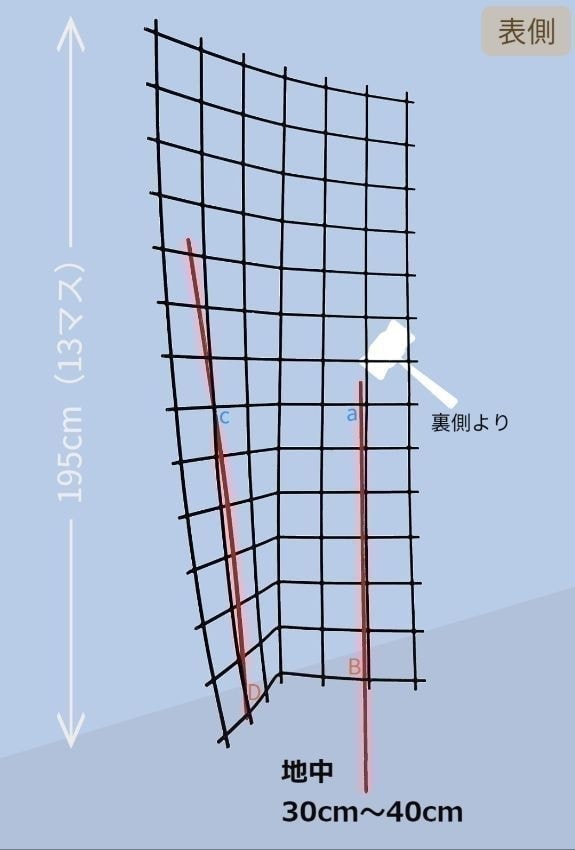 布は湾曲して針を刺せますが、金網は湾曲した形状(デザイン)にしておかないと鉄筋杭を刺すことができません!