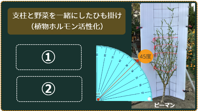 ①野菜を支柱の横幅内に収めると 枝は45度~90度の垂直に近づく