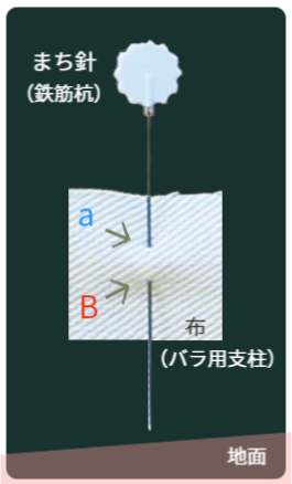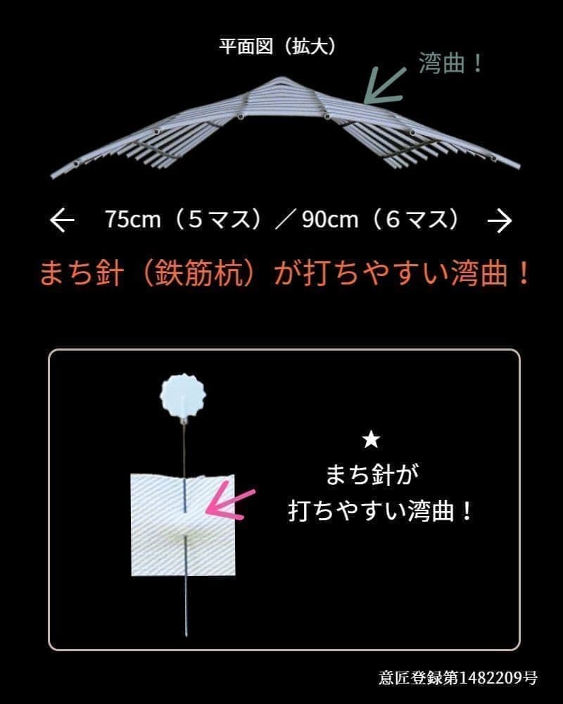 布は湾曲して針を刺せますが、金網は湾曲した形状(デザイン)にしておかないと鉄筋杭を刺すことができません!