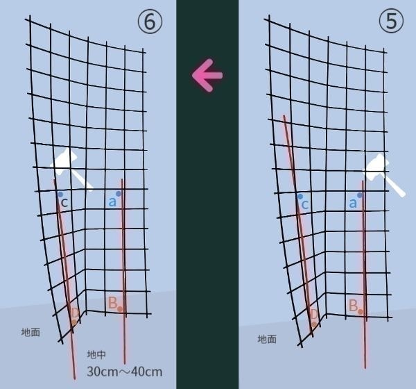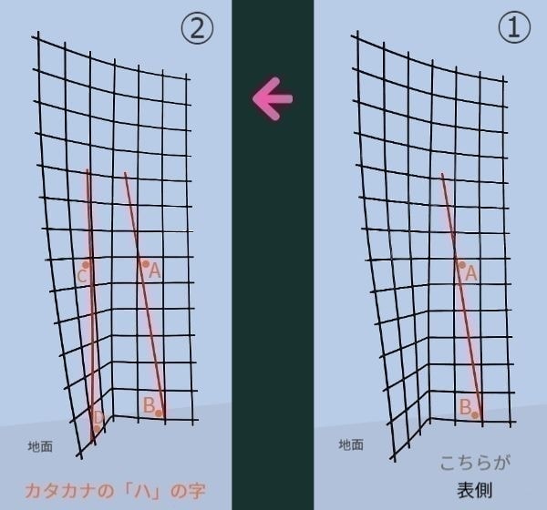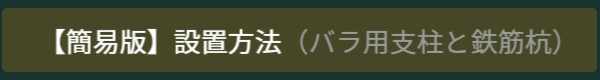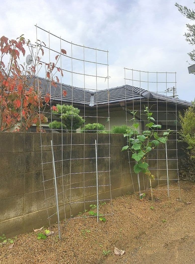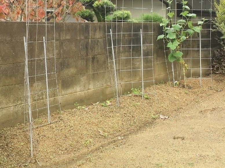 「バラ用支柱」は、後半でご紹介している「イノシシ用フェンス」の半分の横幅で倍ほどの高さとなっています。よって、横方向の力に弱く金網と杭がずれようとしますが金網と杭をひも等で縛っておけば対策となります。