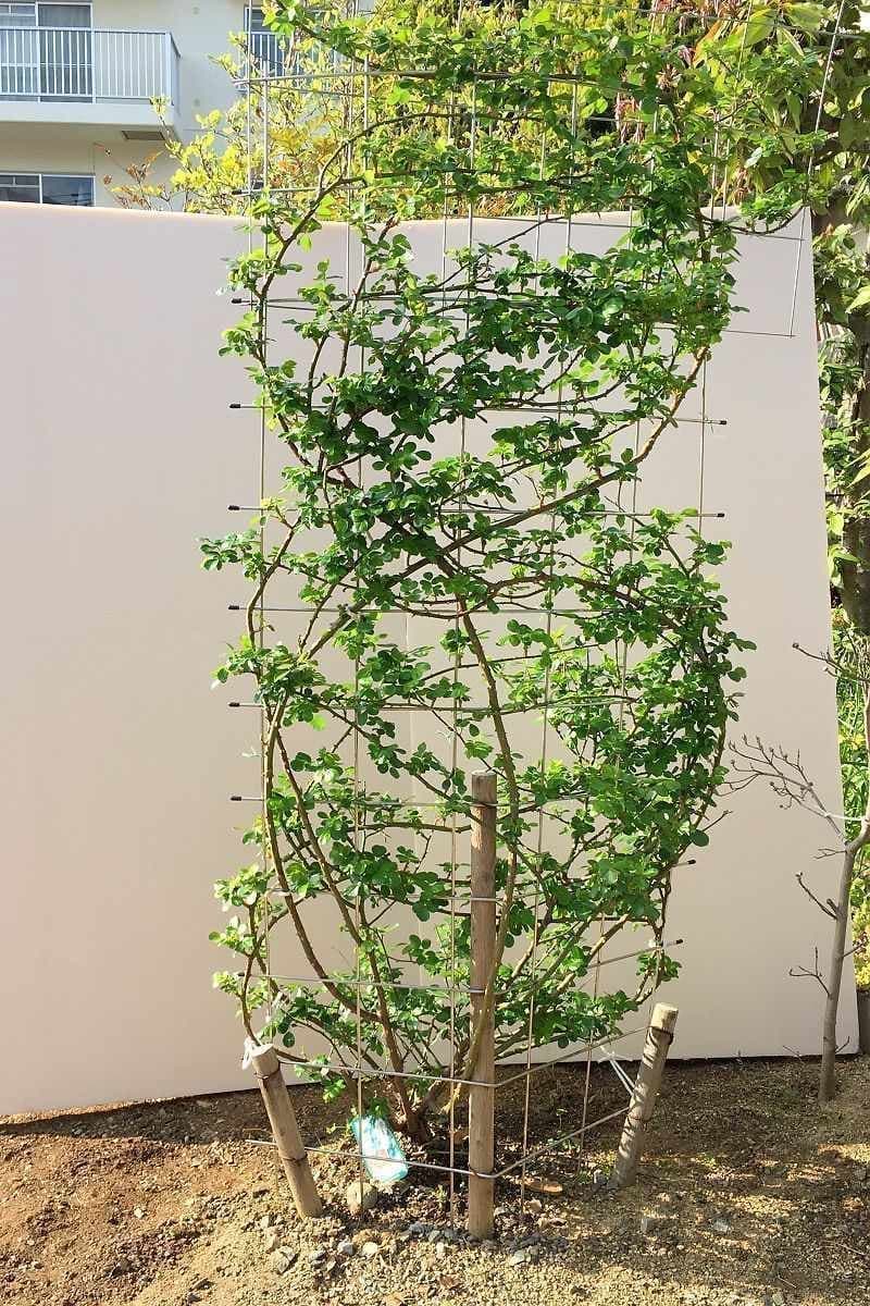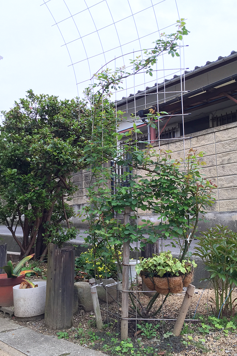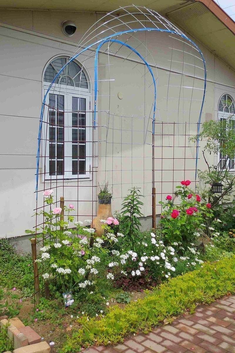 格子状(15cm角)のマス目を特徴とする「バラ用アーチ」は、ネジや部品を使用しないのでバラの邪魔をしません(特許第5367141号、意匠登録第1482209号)