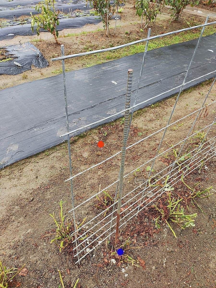 「バラ用支柱」のように布(金網)とまち針(杭)だけで双方を固定できないので保持する力は弱いものの、バラ用支柱の半分の高さなのでネジや部品を使用しない同じ固定ができます。